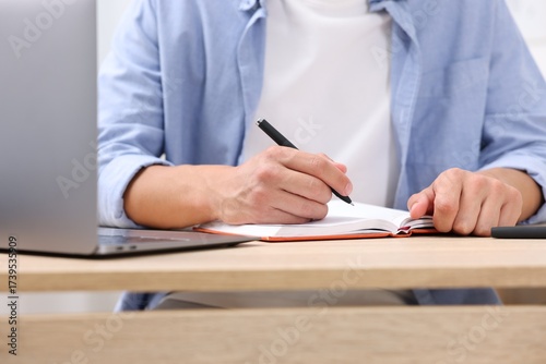 Man taking notes while passing online test via laptop at wooden table indoors, closeup