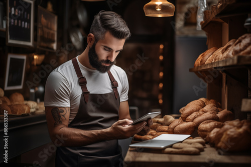bakery, sale, background, bread, man, shop, owner, baker, tablet, order, checking, food, business, entrepreneur, laptop, small business, working, kitchen, counter, tied-up, men at work, retail, store, baked, male, customer service, profession, passion, pride, quality, crusty, flour, warm, light, baking, work, showcase, pastry, employee, job, confident, adult, people, selling