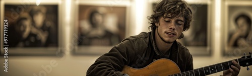 man, playing, guitar, room, banner, copy space, musician, acoustic, string, melody, chord, performance, talent, skill, harmony, instrument, strumming, sound, singer, songwriter, creative, artist, practice, passion, tune, live, stage, concert, entertainment, solo, jamming