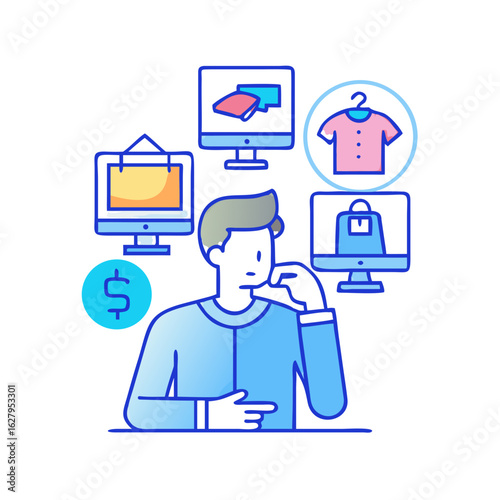 Man thinks about what to sell in his online store. A different niche, such as clothing, real estate, food or furniture.