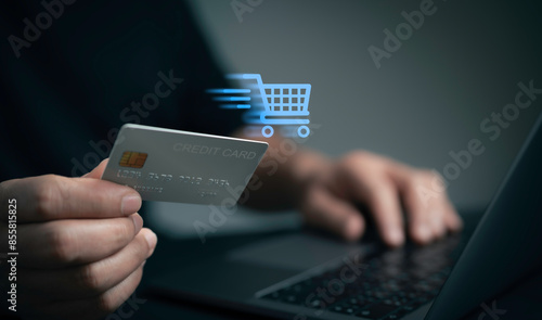 Man use labtop with online shopping digital cart with credit card for shopping payment online with application.Intelligent E-commerce,internet banking payment,financial technology. lifestyle.