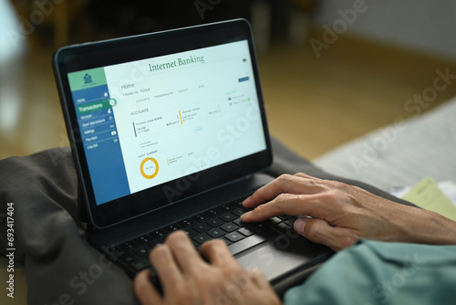 Man using digital tablet at home for reviewing bank account. Technology and finances concept.