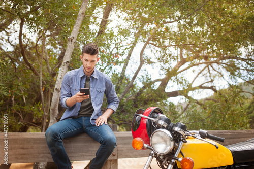 man, mobile phone, wooden, railing, motorcycle, sitting, transportation, lifestyle, wireless technology, casual clothes, tree, technology, holding, phone, nature, confidence, headwear, jacket, photogenic, wood, communication, travel, helmet, calmness, connection, avocation, front view, day, outdoors, one person, young adult, young men, male