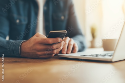 man, mobile, phone, laptop, desk, computer, wooden, office, communication, social, media, marketing, technology, cyberspace, business, digital, online, device, work, table, indoor, person, male, adult, workspace, connection, network, typing, using, shirt, denim, casual attire, lifestyle, modern, corporate, freelance, entrepreneur, startup, planning, strategy, project, success, close, up