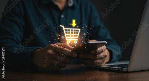 Man using smartphone for online shopping digital cart e-commerce business innovation technology future retail internet marketplace purchase