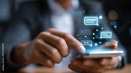 messaging, smartphone, communication, business, technology, mobile, connection, cyberspace, digital, chat, online, network, device, app, contact, text, typing, sending, receiving, notification, user, interface, hand, finger, person, man, male, adult, office, work, corporate, professional, modern, contraption, screen, display, application, ai, cloud, computing, datum, information, innovation, future, virtual, hologram, glow, light