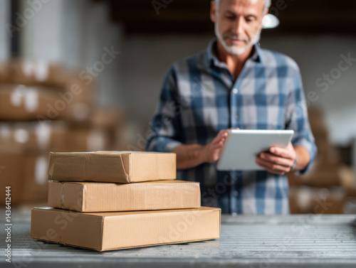 Man using tablet in warehouse with stacked cardboard boxes on table, focused on logistics and shipping tasks