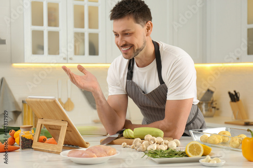 table, background, indoor, cooking, kitchen, home, cyberspace, class, study, learning, cook, food, ingredient, receipe, eat, adult, lifestyle, hobby, leisure, person, male, man, delicious, tasty, caucasian, happy, smiling, computer, tablet, watching, healthy, lesson, course, diet, health, chef, website, video, instructing, blog, making, dinner, online, product, vegetable