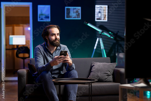 Man watching TV in apartment and answering business related messages on mobile phone. Teleworking worker on couch in living room looking at movies and responding to texts on smartphone