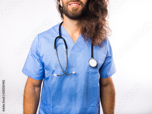 men at work, medical care, smile, uniform, doctor, professional, job, man, nurse, stethoscope, medicals, medicine, isolated, young, white, health, care, blue, people, beautiful, hospital, lady, portrait, happy, person, scrub, background, girl, clinic, surgeon, practitioner, adult, male, caucasian, medic, female, occupation, specialist
