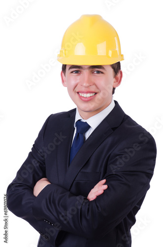 Man wearing hard hat isolated on white