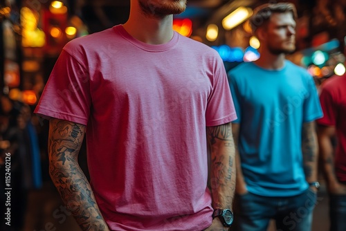 man, pink, t-shirt, tattoo, night, outdoors, standing, urban, city, street, light, bokeh, background, blurred, dark, evening, casual attire, clothing, apparel, fashion, style, model, portrait, summer, warm, colours, texture, fabric, sleeve, arm, wristwatch, watch, detail, young, adult, male, person, image, photo, photo