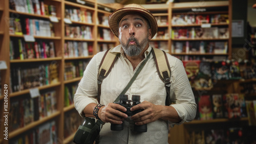 Man wearing pith helmet and backpack holding binoculars in a library among bookshelves, making a surprised puckered face; curiosity exploration.