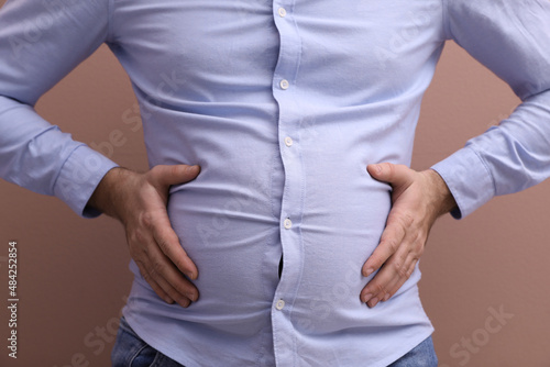 Man wearing tight shirt on pale pink background, closeup. Overweight problem