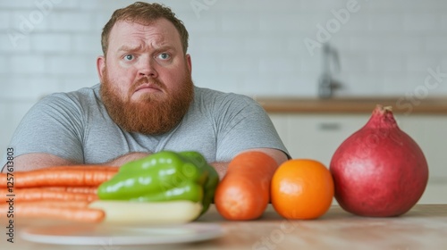 man, kitchen, table, vegetable, fruit, carrot, pepper, onion, pomegranate, orange, healthy, food, diet, nourishment, worry, concern, expression, indoor, lifestyle, wellness, choice, balanced, ingredient, natural, fresh, cooking, meal, preparation, dieting, weight, anxiety, health, eating, culinary, emotion, portrait, casual attire, adult, male, serious, grocery, household, colourful, fresh produce, personal, home