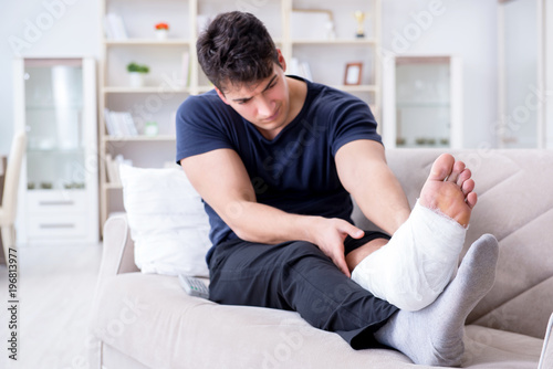 man, home, accident, broken, leg, trauma, injury, recovery, recovering, health, medicals, care, rehabilitation, orthopedics, disabled, injured, sick, leaves, vacation, bone, operation, healing, patient, treatment, health care, bandage, procedure, surgery, suffering, invalid, handicapped, disability, businessman, men at work, house, sofa, couch, foot, aid, working, fracture, plaster bandage, make well, programme, training, exercise, hard, motivated, motivation, aim