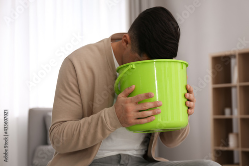 Man with bucket suffering from nausea at home. Food poisoning