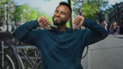 man, thumb, down, street, hispanic, young, outdoors, hoodie, bicycle, city, disapproval, rejection, gesture, tattoo, piercing, beard, sweatshirt, urban, building, pedestrian, guy, blue, dislike, smirk, walking, earring, sidewalk, expression, public, casual attire, signal, negative, attitude, jewellery, pose, reaction, ring, candid, accessory, dissent, opinion, statement, urbanism, closeup, detail, foreground, metallic, adult