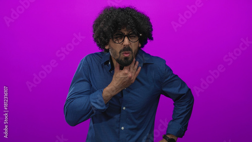 man, neck, clutching, studio, curly, hair, goggles, magenta, blue, shirt, painfully, throat, pain, disease, medicals, ache, discomfort, health, symptom, male, beard, moustache, afro, grimace, wristwatch, holding, pressing, gripping, cough, sick, unwell, painful, breathing, respiratory, infection, symptom, health care, voice, vocal, grimacing, gesture, expression, lighting, vibrant, purple, pink