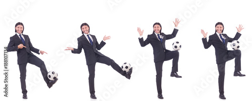 background, isolated, white, active, ball, business, businessman, businessperson, competition, confident, corporate, elegant, entrepreneur, executive, expression, football, football player, fun, game, goal, happy, holding, job, leadership, leisure, male, man, manager, play, player, power, professional, soccer, sport, success, suit, attaching, tournament, work, men at work, young, composite, collage, set, montage, collection, compilation, variation, various, pose