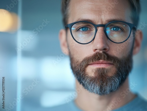 man, goggles, portrait, face, adult, beard, male, eye, person, serious, looking, camera, caucasian, businessman, one person, closeup, head shot, professional, middle-aged, confident, smart, photogenic, blue, spectacle, eyeglass, business, executive