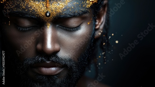 man, hinduism, make-up, gold, glistering, gem, eye, closed, portrait, face, texture, skin, beard, artistic, serene, meditative, decorative, dark, background, beauty, peaceful, calm, expression, spiritual, creative, fashion, elegant, glow, shine, mystic, cultural, style, closeup, detail, luxury, sophistication, divine, relaxation, mystical, calmness, sharpened, concentrated, ethnic