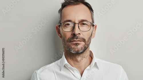 Man with grey hair and beard in glasses, photographed against a plain backdrop, presenting a calm and composed demeanor of thoughtful maturity.