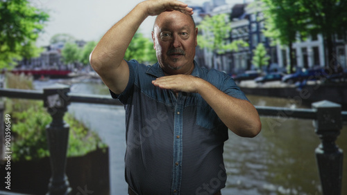 man, hand, measuring, street, senior, hispanic, male, denim, shirt, forearm, playful, curiosity, framing, pose, smile, standing, canal, bridge, water, building, gesture, measure, height, boat, travel, tour tourism, vacation, mature, moustache, expression, elderly, urban, casual attire, relaxed, signal, measurement, holiday maker, hand, posing, posture, pocket, sightseeing, goatee, grin, aged, approachable, leisure, excursionist