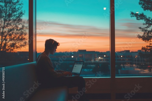 man, person, earphones, laptop, computer, window, glasses, pane, light, sunset, dusk, evening, sky, cloud, city, urban, building, work, office, desk, silhouette, shadow, sharpened, blur, indoor, view, sitting, working, typing, keyboard, hand, arm, leg, clothing, dark, warm, bright, colourful