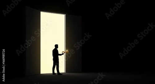 door, light, dark, silhouette, man, key, opening, opportunity, future, hope, choice, exit, entrance, unknown, mystery, path, challenge, decision, escape, freedom, way, success, bright, shadow, person, standing, inside, open, unlock, solution, vision, goal, dream, inspiration, motivation, potential, discovery, adventure, journey, new