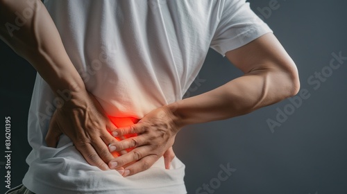 man with lower back pain with red spot on the lower back isolated on grey background, injury in muscles or tendons in the back