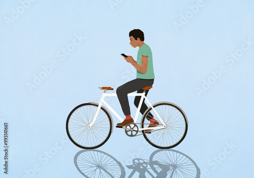 horizontal, illustration, adult, bicycle, blue background, color image, cycling, distracted, electronic mail, full-length, cyberspace, journey, man, mobile phone, motion, multitask, one person, people, riding, half face, sitting, technology, text messaging, transportation, wireless technology, young men, youth culture