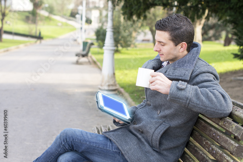 Man with tablet computer and coffee cup sitting on wood bench, o