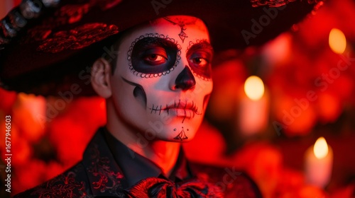 Man with traditional calavera makeup and sombrero, celebrating Day of the Dead. Mexican cultural event. Halloween party costume.