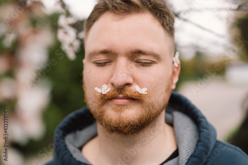 flower, happy, man, face, beauty, beard, photogenic, moustache, hair, style, adult, spring, bloom, coiffure, unshaved, portrait, romance, hand, charisma, styling, model, sweater, floral, warmth, haircut, cherry, guy, sun, black, emotion, smile, white, leaf, tree, cheerful, branch, look, concept, bearded, hipster, flower petals, joy, happiness, park, outdoors, barbershop, blossom
