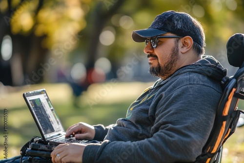 man, wheelchair, laptop, park, working, sunny, afternoon, nature, outdoors, tree, greenery, leisure, technology, accessibility, concentration, sunlight, casual attire, activity, relaxation, clothing, goggles, cap, sitting, community, freedom, comfort, urban, peaceful, connected, hobby, modern, lifestyle, diverse, creativity, innovation, productivity, inclusion, interaction, environment, digital, serene, joy, open, space, warm, weather, setting, personal, social
