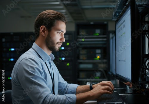 server, room, technology, datum, center, network, cyberspace, computer, screen, keyboard, male, man, adult, business, professional, engineer, technician, working, typing, monitor, desktop, information, digital, security, web, coding, system, software, programming, office, serious, concentrated, focused, expert, server room, data storage, information technology, connectivity, innovation
