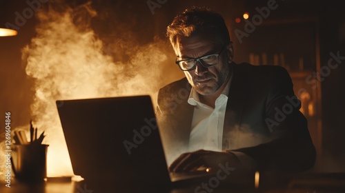 man, person, sitting, table, laptop, computer, office, workspace, desk, typing, digital, technology, work, professional, business, entrepreneur, freelancer