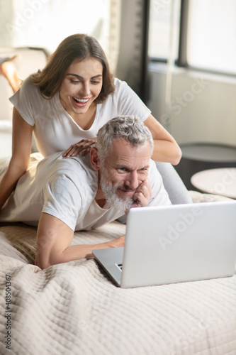 waist up, weekend, comfortable, laptop, work, self employed, tied-up, man, young, woman, apartment, information, bed, screen, couple, looking, home, adult, cyberspace, mature, happiness, husband, morning, dark-haired, pajama, together, lying, grey-haired, modern, online, smiling, long-haired, human relationships, marriage, wife, bedchamber, smile, bearded