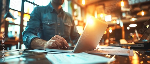 Man working on laptop in a cozy coffee shop with warm lighting, surrounded by paperwork, creating a productive and inspiring work environment.