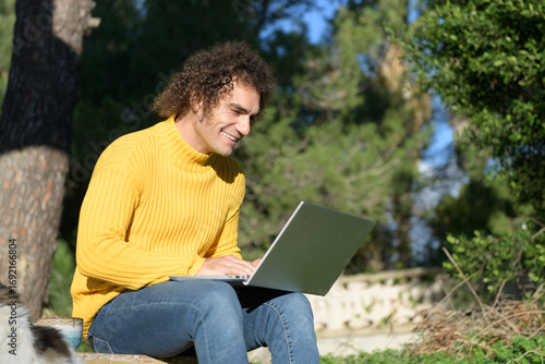 man, laptop, garden, work, home, remote, sunny, yellow, sweater, nature, freelance, digital, smile, sharpened, technology, green, wireless, communication, cyberspace, casual attire, lifestyle, crop, leisure, productivity, environment, relaxed, day, creative, free, comfortable, job, modern, sitting, happy, business, fresh, air, independent, computer, curly hair, looking down, half face