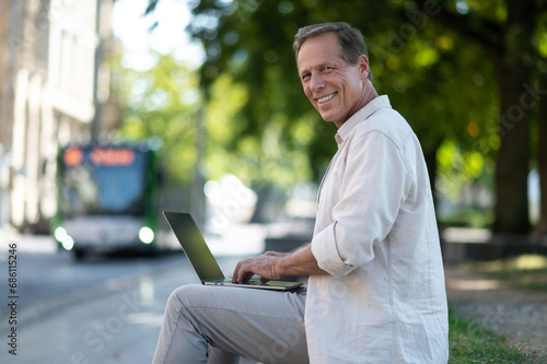 contraption, nature, spring, bench, user, male, open air, casual attire, freelance, sitting, happy, air, portrait, person, man, holiday maker, lifestyle, laptop, tree, park, caucasian, network, online, rest, natural, adult, job, green, computer, notebook, city, outside, guy, student, people, street