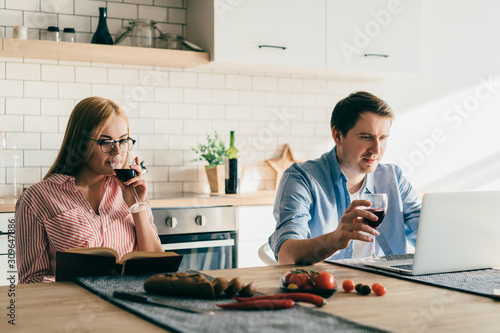 couple, laptop, book, reading, drink, wine, love, affection, smiling, communication, connection, together, business, freelance, job, education, human relationships, hobby, kitchen, men at work, contraption, device, alcohol, glasses, goggles, literature, lover, beverage, desk, table, relax, rest, young, youth, urban, serious, concentrated, sitting, studying, browsing, drinking, indoor, horizontal