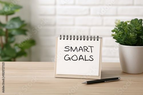 Management Resources Goal-Setting. Notepad displaying "SMART GOALS" with a pen and a potted plant on a wooden desk.