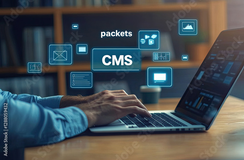 content management system, laptop, workflow, efficiency, technology, digital, online, interface, user, man, hand, typing, keyboard, screen, datum, information, packet, electronic mail, file, list, chart, graph, image, design, website, software, application, business, productivity, work, professional, modern, blue, dark, night, serious, focused, concentration, cyberspace, network, innovation