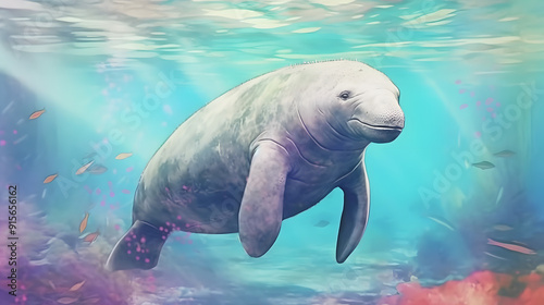 Manatee under at sea watercolor style