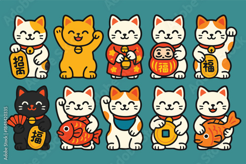 Maneki-neko Lucky Cats Collection Waving Cute Cartoon Vector Illustration