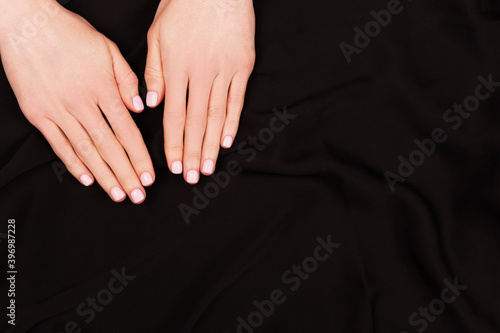 Manicure and nail care concept. Minimal composition of the woman hands on the black background. Classic pink nail polish. Flat lay, top view. Copy space for your text.