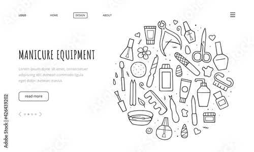 Manicure equipment set. Landing page template. Collection hand drawn different tools. Doodle sketch style. Vector outline illustration.