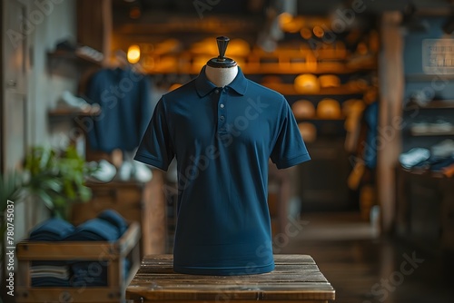 mannequin, modelling, dark, blue, polo, shirt, minimalist, store, setting, fashion, display, clothing, style, trendy, chic, retail, design, outfit, window, modern, contemporary, urban, sleek, elegant, sophisticated, visual, merchandising, showcase, garment, space, industry, styling, decor